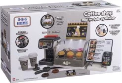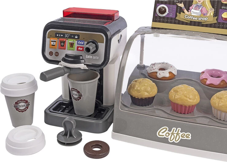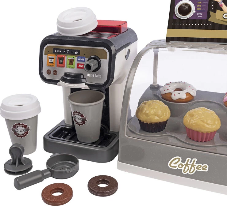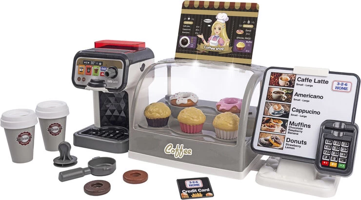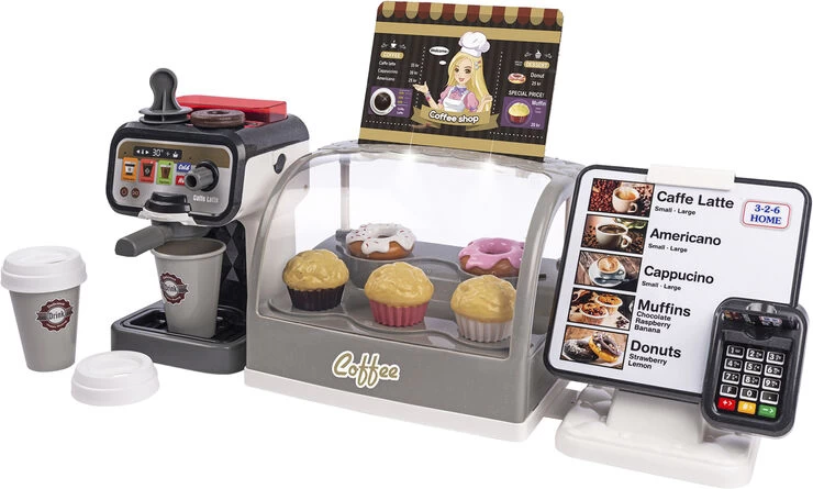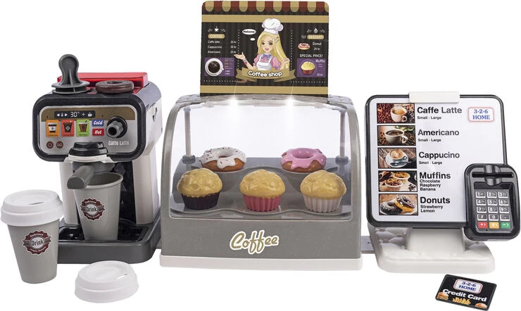 Coffee shop med lys. lyde og tilbehør Med touchskærm og kortlæser med lyde, kagemontre med lys, espressomaskine med tilbehør. muffins og donuts, kreditkort og 2 drikkekopper med låg Inkl 2 stk AAA-batterier og 3 stk knapcellebatterier