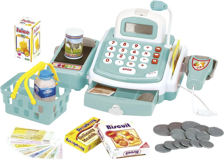 Stort kasseapparat med lys, lyd og tilbehør Med mikrofon. rigtige kasselyde, regnemaskine, scanner, varebånd, kreditkort. penge samt indkøbskurv med varer Bruger 2 stk AA-batterier