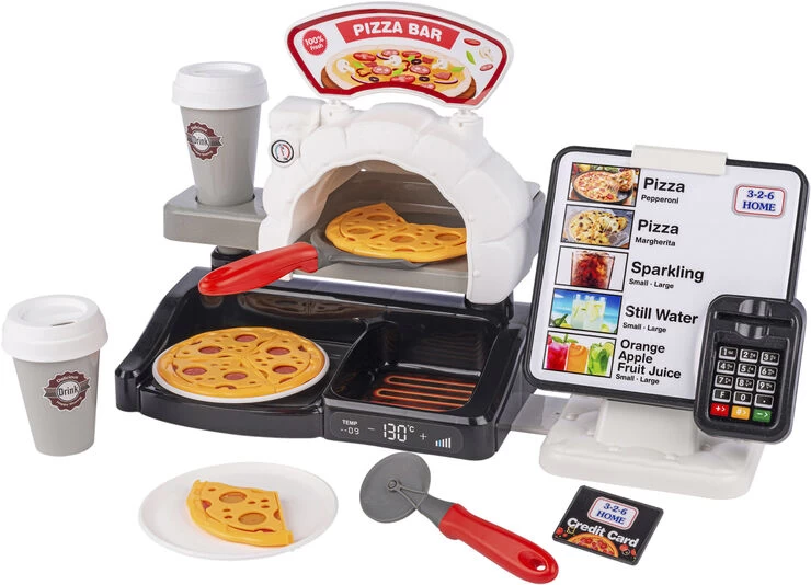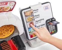 Pizzabar med lyde og tilbehør Med touchskærm og kortlæser med lyde, kreditkort, 2 delelige pizzaer med tallerkener. pizza-hjul og -spade og 2 drikkekopper med låg Inkl 2 stk AAA-batterier