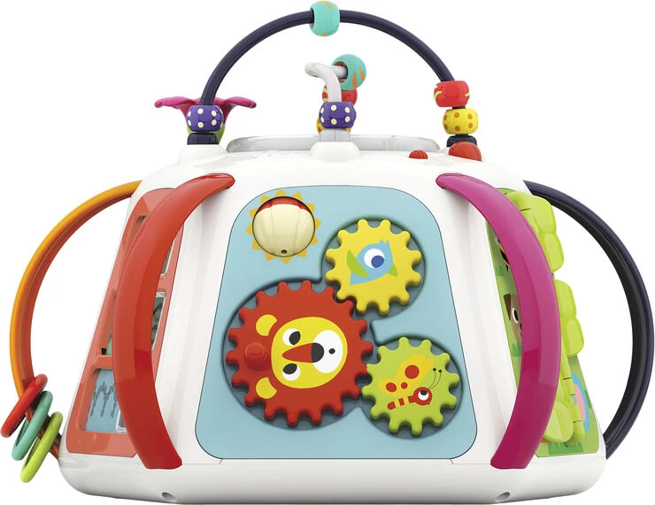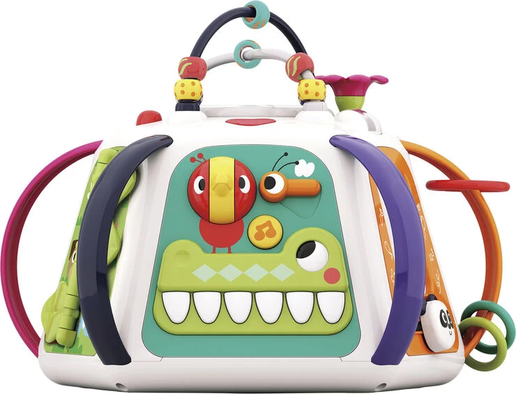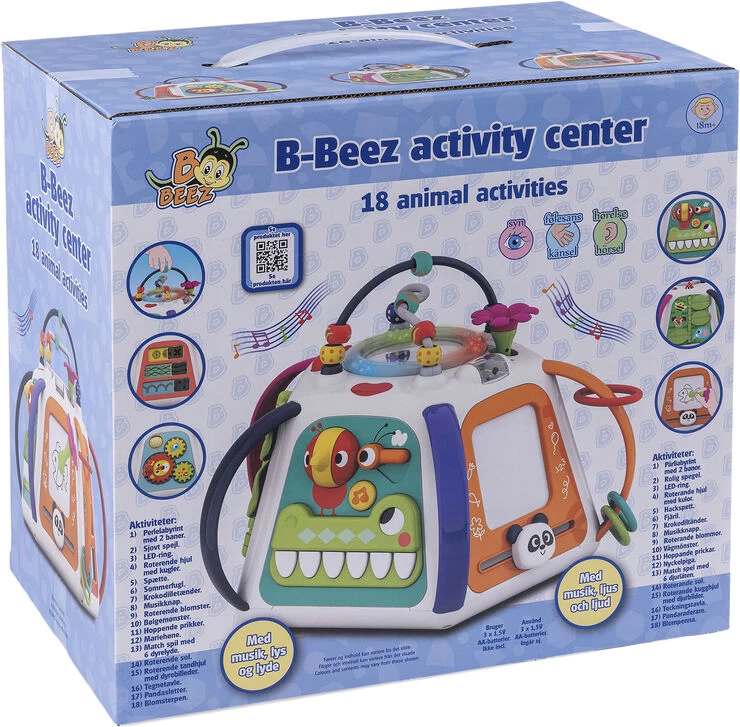 Stor aktivitetspyramide med musik, lys og lyde Med 18 forskellige aktiviteter Feks LED-ring der lyser i forskellige farver når funktioner aktiveres, sjove lyde og melodier, matchspil med dyrelyde, roterende tandhjul med melodier, tegnetavle mm Bruger 3 stk AA-batterier
