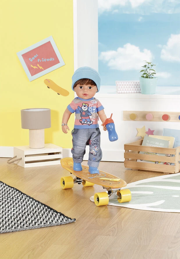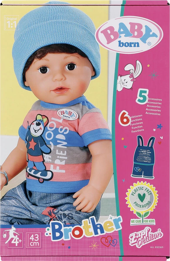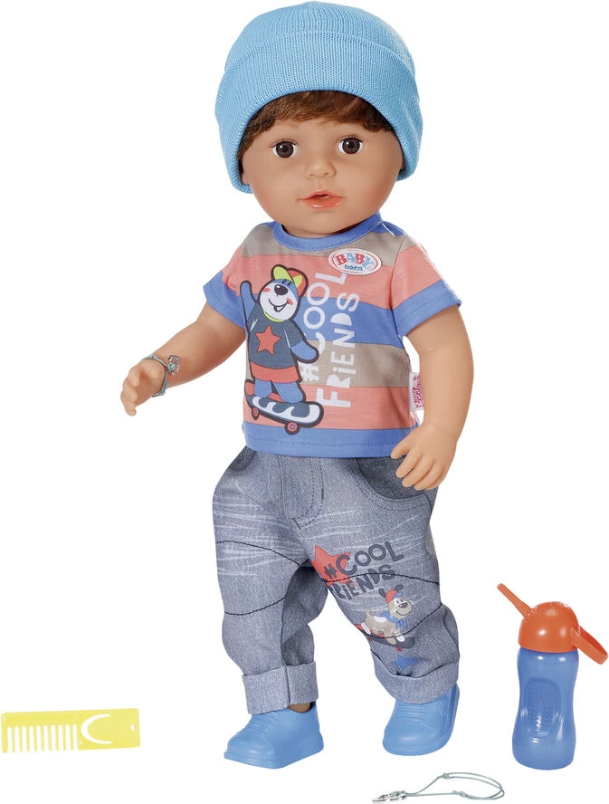 BABY born bror dukke 43 cm med T-shirt, bukser, hat og sko flaske, kam og 1 venskabsarmbånd til barn og dukke Fra 4 år