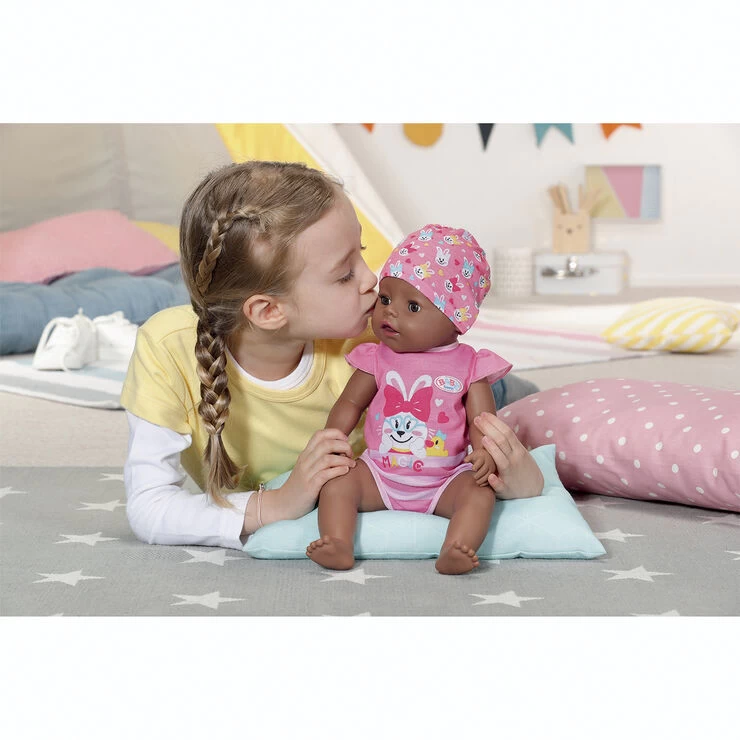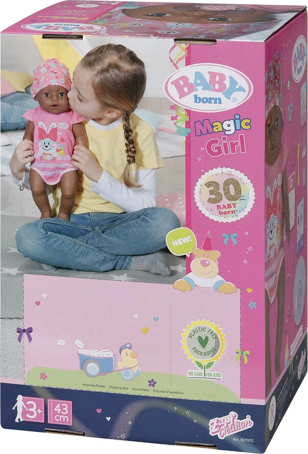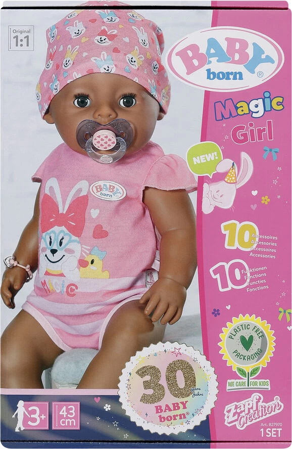 BABY born Magi pigedukke 43 cm med body og hue,potte, ble tallerken med ske,1 portion grød, 1 magisk sut, 1 flaske, 1 fødselsattest, venskabsbånd til barn og dukke Fra 3 år