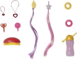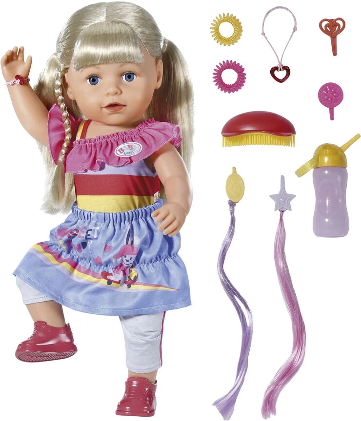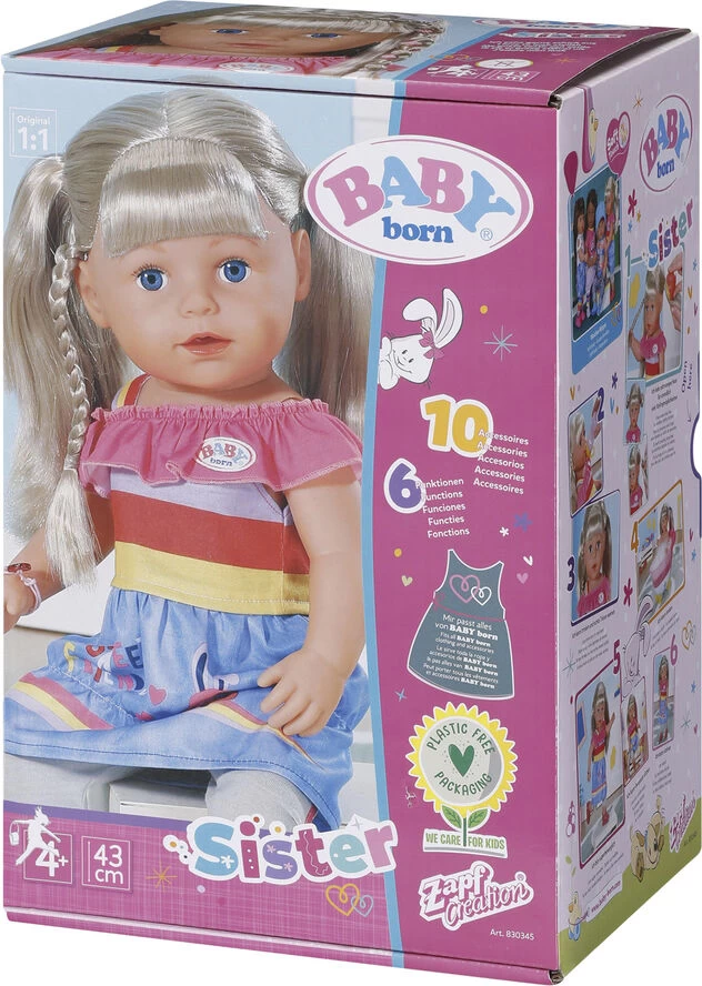 BABY born søster 43 cm med kjole, leggings og sko Følgende tilbehør medfølger flaske, hårbørste, 2 spiralelastikker, 2 hårspænder, 2 klips med hår extensions og venskabsarmbånd til barn og dukkeFra 4 år