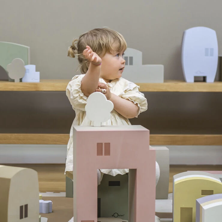 Town City Tower er i to dele. De kan bruges sammen eller hver for sig som skamler til at sidde eller gå på. Hvis den lille del trækkes lidt ud, kan City Tower bruges af barnet som en trappe, når køkkenbordet eller håndvasken skal nås – den perfekte hjælper i alle husets rum. Du kan bruge Town City Tower alene, eller du kan bruge det med andre Town-huse og lege med det på tumlegulvet med vejbaner. Byg din egen by, måske kan du genkende mormors hus eller din bedste vens? Town er perfekt til både aleneleg og sammen med andre. Det stimulerer både fantasi og motorik, samtidig med at det giver anledning til samtale mellem barn og voksen om barnets plads i verden, det nære miljø, trafikregler, m.v. Town forener alt det bedste fra vores klassiske designs med en ekstra dimension. Town-kollektionen er skabt til familiens lille arkitekt som en hyldest i børnehøjde til Norden og de nordiske byer København, Stockholm, Oslo, Helsinki og Tórshavn. Her kan tumles, vippes og siddes på byens tage og leges kreativt med de forskellige Town-dele, så barnet kan bygge sin egen lille by.