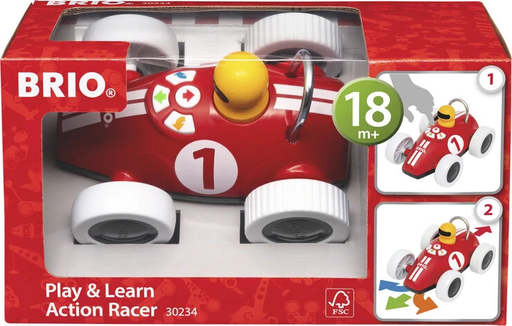 Start motoren. for 30234 action racer er på linjen og klar til at køre Tryk på en af de fire retningsknapper på bilens instrumentbræt, og spænd selen parat til et løb. når den ræser af sted gennem rummet Denne lille racerbil er baseret på den ikoniske BRIO racerbil til børn fra 18 måneder og op, og den er en hjælp til at lære det basale om årsag og virkning via spændende leg Denne legetøjsracerbil giver små børn en tidlig introduktion til STEM-læring Leg og lær med denne hurtige legetøjsbil. der følger dine input og ræser gennem rummet Alderstilpasset design med enkle knapper til børn fra 1 år kør frem, til venstre, til højre eller baglæns med tryk på 1 knap Bruger 4 stk AAA batterier ikke incl Fra 18 måneder