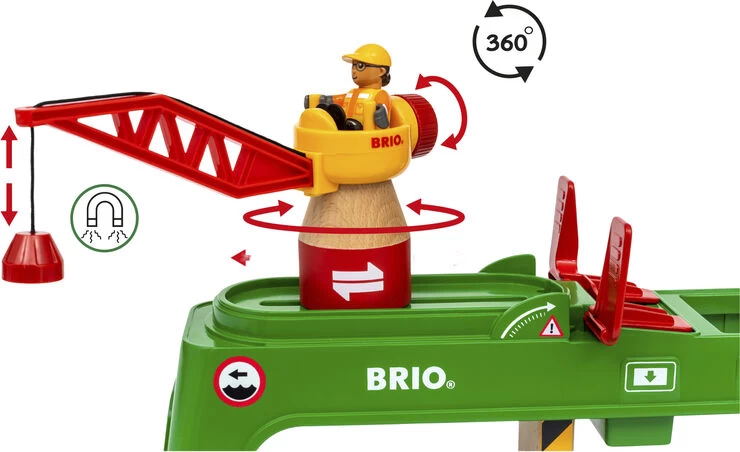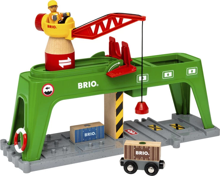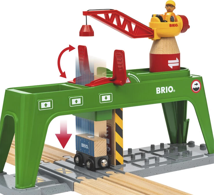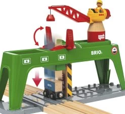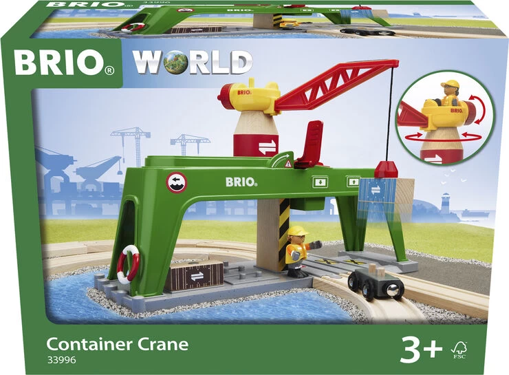 Det er ikke noget problem at klare de tunge skibscontainere i BRIO World havnen med 33996 Containerkran Sæt dig tilrette i toppen af dette store, grønne tilbehør til togbanen, og gå i gang med arbejdet Grib en af containerne med den magnetiske krog, drej og skub den store kran i position over skinnerne Lidt til venstre. lidt til højre Perfekt! Sænk godset i træ på plads med spillet, og lås det med den røde lås, inden den bliver sænket perfekt ned på den ventende togvogn nedenunder Tag kontrollen over BRIO World havnen med 33996 Containerkran Grib en af containerne med den magnetiske krog, drej og skub den store kran i position over togskinnerne Til børn i alderen 3-