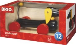 Dette elskede og klassiske trækdyr har eksisteret siden 1958 Den klassiske gravhund i træ, som børnene elsker at trække efter sig! Træhunden bevæger hovedet, halen og ørene. når barnet trækker den efter sig! Længde 20 cm Fra 12 måneder