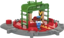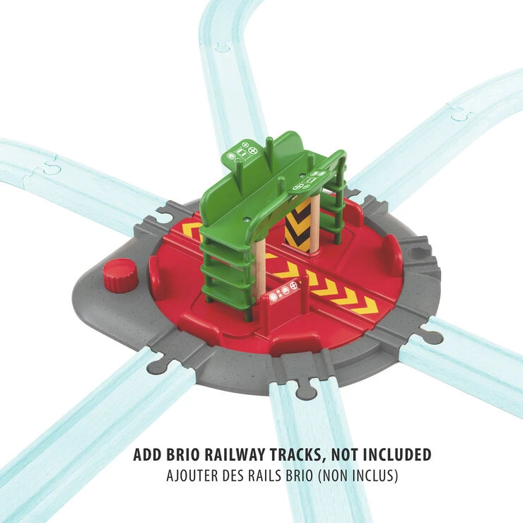 33476 Drejeskive og figur er med de syv sporforbindelser et ægte, centralt punkt i enhver BRIO World togbane Drejeskiven har plads nok til et lokomotiv fra BRIO World drej på den røde knap, og se hele den centrale del rotere og klikke på plads Der medfølger en togingeniør-figur, der kan betjene drejeskiven fra sin station Forbind drejeskiven til din eksisterende togbane i træ i syv forskellige retninger, og skab et nyt centrum for din BRIO World togbane Virkelighedsbaseret togbaneleg hjælper barnet med at forstå og lære om omgivelserne på en sjov måde og samtidig udvikle sine finmotoriske færdigheder 2 dele Til børn i alderen 3-