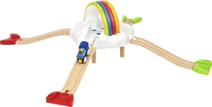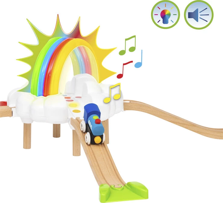 Følg lyset. og få regnbuen til at lyse i 36002 Light Up Regnbue-sæt Dette interaktive togsæt introducerer små børn til basale mønstre for rækkefølge og årsag og virkning på en sjov og engagerende måde Formålet er enkelt få regnbuen til at lyse med alle dens smukke farver Det gør du ved at følge de blinkende lys på skinnerne med det lille trætog Hver gang du følger lyset korrekt gennem skyen og klarer udfordringen, lyser regnbuen op i en af dens fire farver, og der afspilles en sød lille melodi Få alle farver til at lyse, og du er heldig at opleve en sjov sang og et lysshow Interaktivt legetøj til små børn der bruger lys og lyde til at lære barnet om rækkefølge og årsag og virkning Formålet er at få regnbuen til at lyse i alle dens smukke farver ved hjælp af det lille trætog