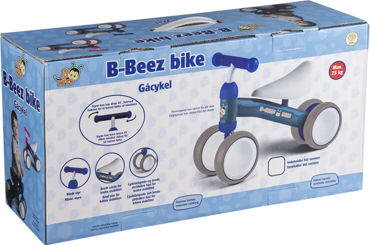 B BEEZ Gåcykel blå Robust gåcykel til de mindste Specifikationer Lyddæmpede og brede skridsikre hjul for god stabilitet Bredt sæde for god stabilitet Blødt styr der kun kan dreje 45 grader, hvorved risikoen for fald mindskes Kan bære op til 25 kg Fremmer barnets motoriske udvikling 34x48x18 cm Siddehøjde ca 25 cm