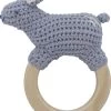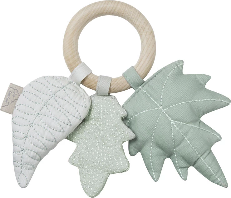 Sød rangle med 3 forskellige blade. Ranglen er håndlavet og har et fint og unikt broderi på hvert blad. Ranglen har en lille træring, der gør det nemt for babyen at holde fast i den. Ranglen stimulerer barnets sanser. To af bladene har sjovt knitre-p