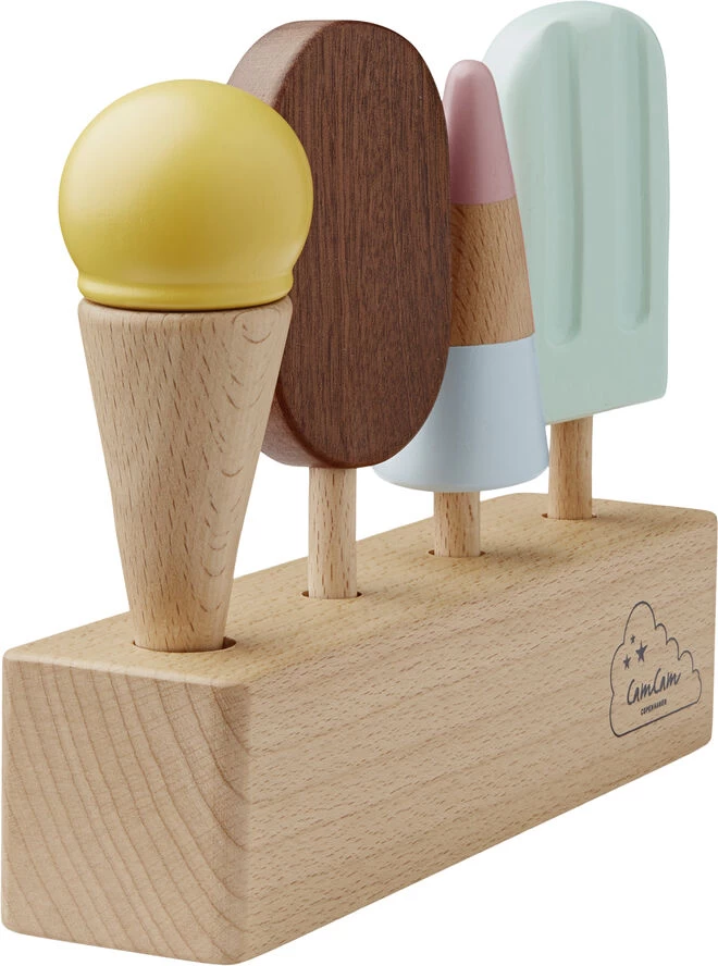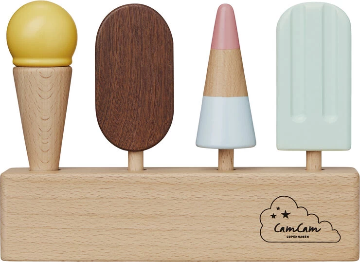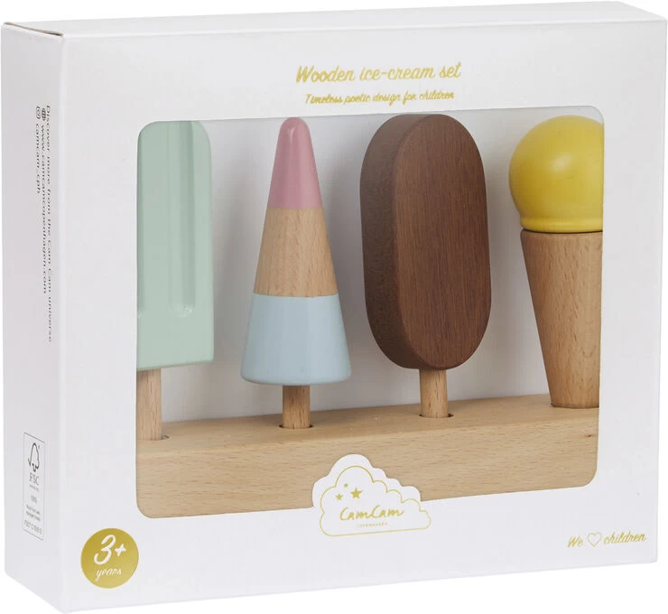 Det sødeste issæt i træ, bestående af fire lækre is i fine farver og en stander til at holde isene. Sættet passer perfekt til Cam Cam Copenhagen Købmandsbutikken, hvor den lille købmand vil elske at sælge is til sine ivrige kunder, der står i kø for