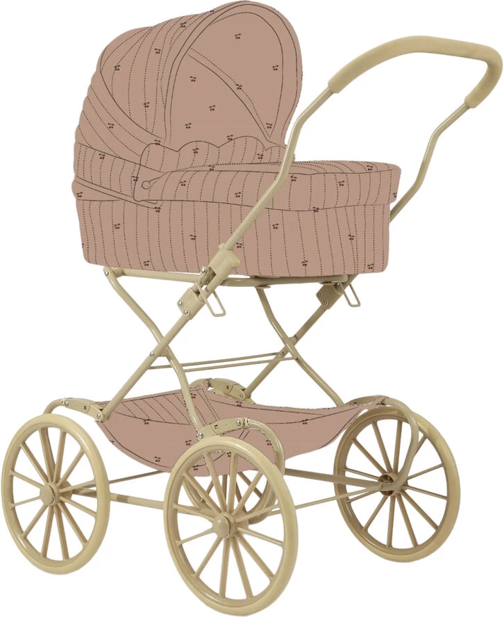“Vintage style doll pram designed with four large wheels made in EVA material for extra stability. Features quilted printed fabric and a mattress made in 100 percent organic cotton. Designed with a softly cushioned storage basket under the lift. The frame is made of metal with spongy soft handles. The doll pram comes fully assembled and is easy to fold and store. H82xW42xD71cm, 3,86kgs Doll Pram with packing 45×16,5x67cm 5,03kgs.”