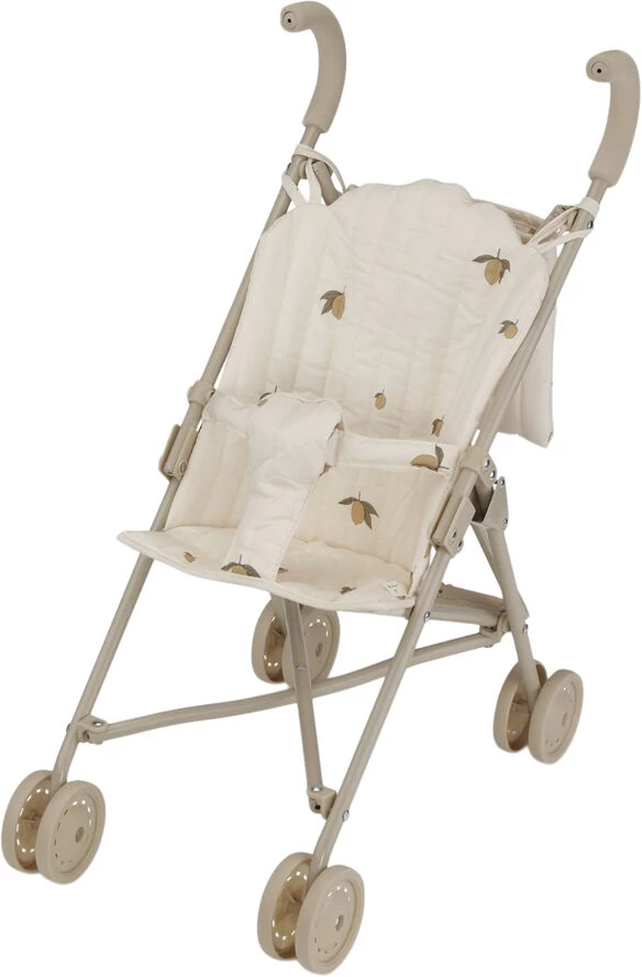 “Doll stroller designed with a harness, carriage bag and double wheels on all four legs for extra stability. Features removable fabric made in 100 percent organic cotton. Comes fully assembled. Easy to fold and store. The frame is made of iron with soft and spongy EVA material at the handles. Measurements- height 56 cm, width 27 cm and depth 46 cm.”