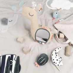 Aktivitets gulvspejlet med Lalee er perfekt til din babys nakketræning. De små vil være underholdt af deres eget søde spejlbillede og de mange sansestimulerende funktioner. Brug elastik-løkken til at fastgøre en sut eller din babys yndlingslegetøj ved hjælp af en ophængsring. Farverige mærker, taktile teksturer samt knitre- og ranglelyde er alle features, der er sjove for små øjne og hænder at udforske på gulvspejlet. Det sandfarvede lama baby-spejl er fyldt med sand og står solidt fast på gulvet.