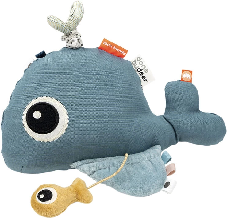 De små underholdes af deres eget spejlbillede, hvilket gør Wally-gulvspejlet ideelt når baby skal øve sig i at ligge på maven. De mange sensoriske funktioner og detaljer vil bidrage til længere og mere aktiv tid på maven for de små. Spejlet, farverige mærker, taktile detaljer, knitre- og klokkelyde stimulerer de små sanser. Lad de små trække i vanddråberne på Wallys hoved og mærk hvordan hele hvalen vibrerer eller opdag hvordan Wallys fiskeven gemmer sig under hvalens finne. Wallys mange funktioner understøtter dit barns udvikling fra aktivitet på mave til siddende leg. Den søde hval står stabilt på gulvet da bunden er fyldt med sand og den kan let flyttes. Den blå hval og sandfarvede fisk er klar til masser af leg.