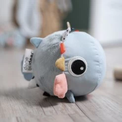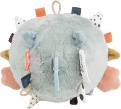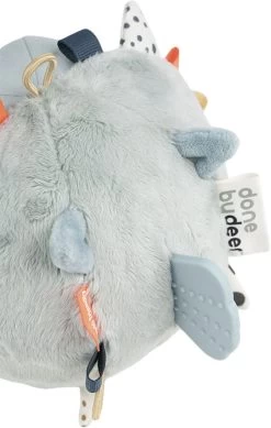 Lad nysgerrige øjne og små fingre gå på opdagelse i Puffee-aktivitetsboldens mange sensoriske detaljer. Hold fast i Puffees bløde pigge og finner og lyt til de spændende knitrelyde. Mærk de forskellige strukturer, og udforsk de farverige mærker. Puffees runde form er perfekt til rul. Puf til den og hør den spændende lyd, der opfordrer de små til at kravle efter den. Silikone bideringen, formet som Puffees halefinne, har forskellige strukturer til at stimulere og berolige gummer som klør. Den kugleskøre kuglefisk er et mix af blå, pudder og mustard farver og har mange funktioner, der stimulerer fin- og grovmotorikken. Elastik-løkken gør det let at fastgøre den til en legemåtte, klapvogn eller aktivitetscenter ved hjælp af et legetøjs-ring