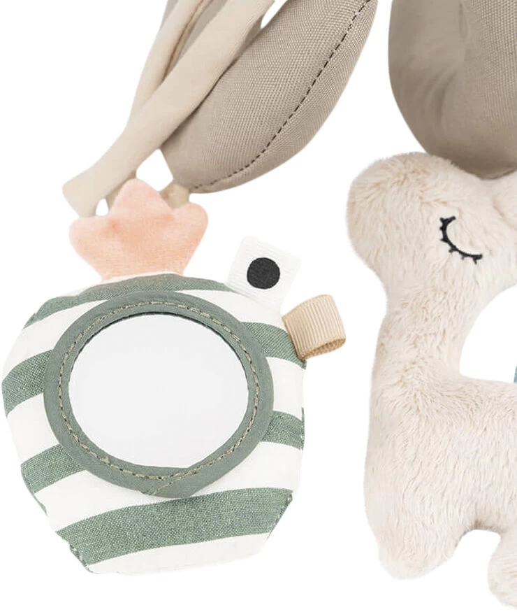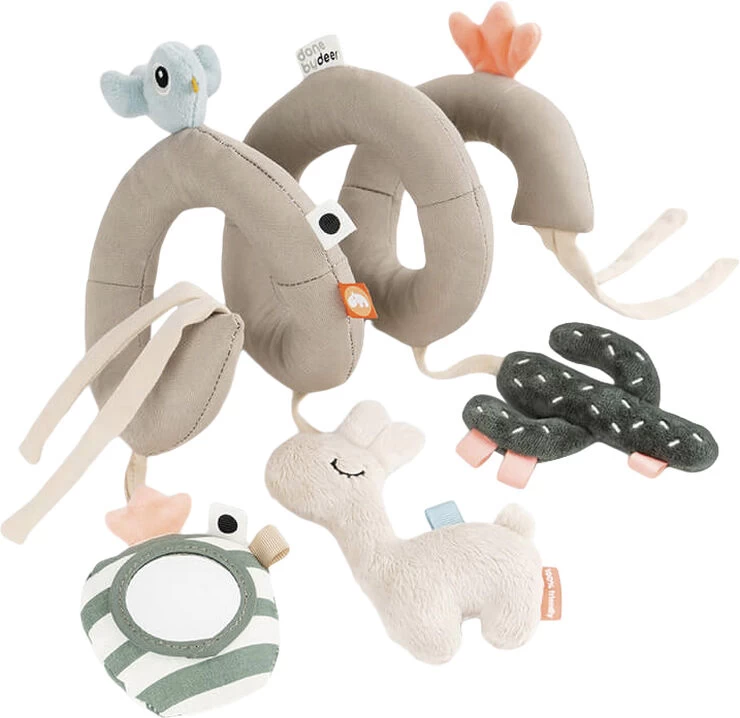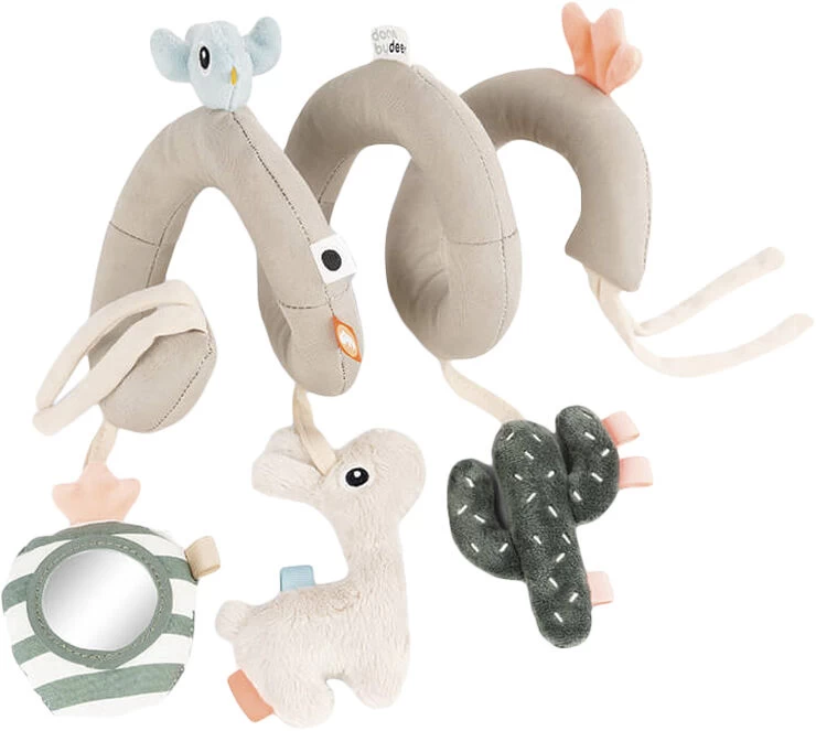 Aktivitetsspiralen med Lalee er det perfekte stykke legetøj på farten. Det er fyldt med sansestimulerende funktioner for din baby og med de bløde bånd kan det fastgøres til autostolen, klapvognen, barnevognen eller tremmesengen. Små fingre kan udforske den bløde Lalee og lytte til de spændende knitrelyde den laver. Den sanse-stimulerende kaktus og det lille spejl med den sjove lyd vil holde din baby beskæftiget og underholdt, når I er på tur. Birdee holder øje fra spiralens top. Baby aktivitetslegetøjet er i lyse farver kombineret med grønne og blå detaljer samt et strejf af en frisk koralrød.