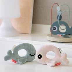 Denne runde rangle med Wally har potentialet til at blive din babys bedste ven. Det store hul i Wallys mave, gør det let for små hænder at gribe om ranglen og de sjove lyde vil underholde din baby. Den bløde ringrangle laver en sød ranglelyd, når den rystes, og finnerne laver en sjov knitrelyd, når man rører ved dem. Finnerne gør det muligt for ranglen at stå selv og er perfekt til leg på maven. Underhold din baby med denne søde, pudderfarvede, ring-formede rangle og dens mange funktioner. På den ene side er Wally’s øje lukket, og på den anden side er Wally vågen og klar til at lege.