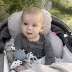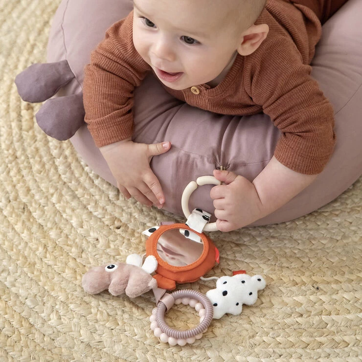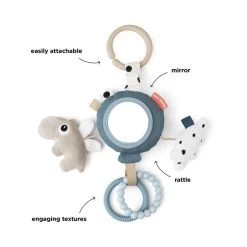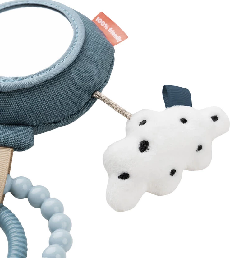 To go aktivitetsspejlet med Happy clouds vil gøre din baby nysgerrig efter at undersøge de spændende, sansestimulerende funktioner. Ozzo vil gøre hvad end der skal til for at din baby føler sig underholdt. Aktivitetsspejlet har en ballon-rangle, en blød Ozzo, en sky, to ringe med sjove teksturer og søde mærker. Barnet kan nemt gribe ringene og holde fast i spejlet. Brug en legetøjsring til at fastgøre den til barnevogn, autostol eller klapvogn. Det blå aktivitetsspejl vil med alle sine legesyge elementer sikre en dejlig leg for de små. Den blå ballon flyver afsted med en sandfarvet Ozzo, to ringe i nuancer af blå og en sød, hvid sky med sorte prikker.
