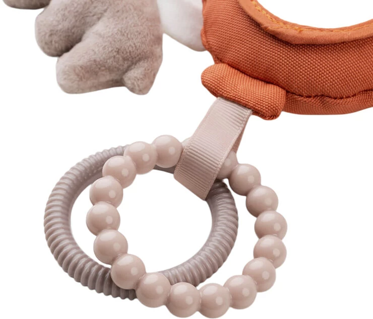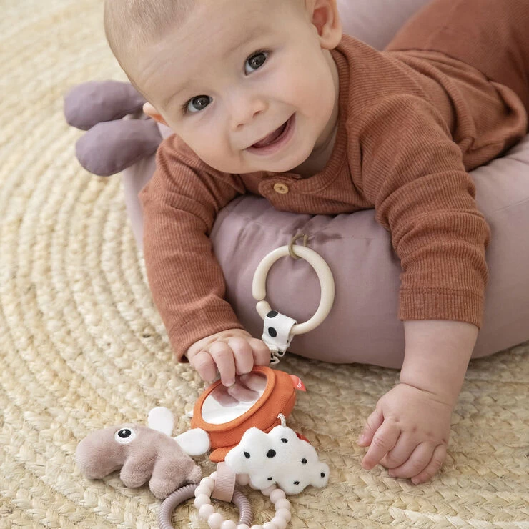 To go aktivitetsspejlet med Happy clouds vil gøre din baby nysgerrig efter at undersøge de spændende, sansestimulerende funktioner. Ozzo vil gøre hvad end der skal til for at din baby føler sig underholdt. Aktivitetsspejlet har en ballon-rangle, en blød Ozzo, en sky, to ringe med sjove teksturer og søde mærker. Barnet kan nemt gribe ringene og holde fast i spejlet. Brug en legetøjsring til at fastgøre den til barnevogn, autostol eller klapvogn. Det papayafarvede aktivitetsspejl vil med alle sine legesyge elementer sikre en dejlig leg for de små. Den papayafarvede ballon flyver afsted med en pudderfarvet Ozzo, to ringe i nuancer af pudder og en sød, hvid sky med sorte prikker.