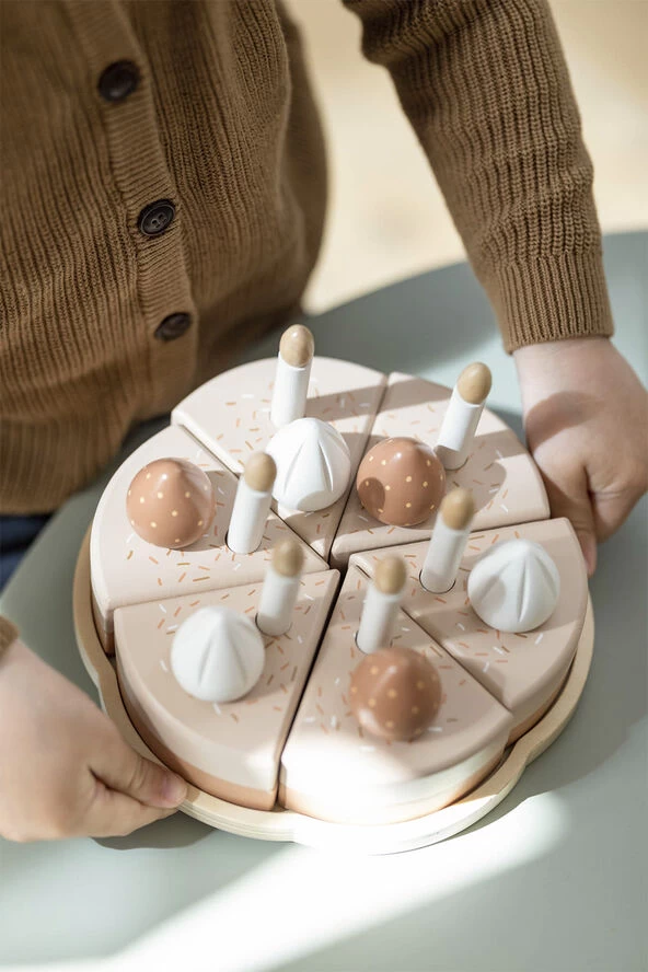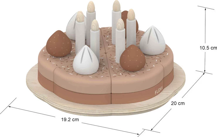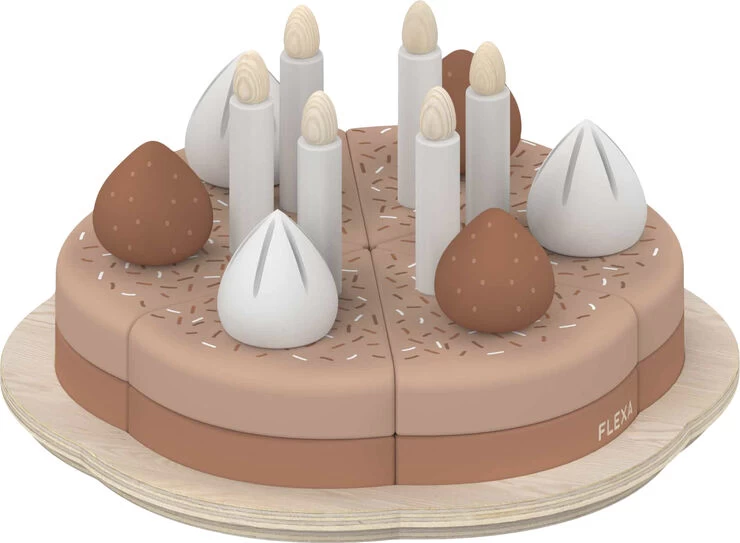 FLEXAs fødselsdagskage indeholder seks stykker kage med glasur, lys, marengstoppe og jordbær. Dette slidstærke og tidløse legetøj er skabt til at holde i mange år og erabsolut perfekt som fødselsdagsgave!