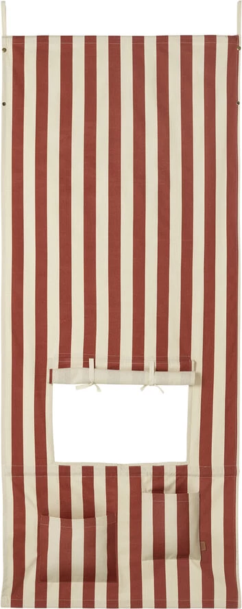 Lad Kids Kiosk give fantasien frit løb hos de små iværksættere i dit hjem. Kids Kiosk er fremstillet af 100 % GOTS-certificeret økologisk bomuld og kan hænges op i døren, når det er tid til leg. Den har et vindue med et rullegardin, to lommer til forskellige varer og trykknapper i messing, så vinduets højde kan justeres alt efter børnenes alder. Kids Kiosk kan bruges til alt lige fra salg af fantasi-isvafler til opførelsen af dukketeater. Du skal blot rulle det lille gardin i vinduet op så er Kids Kiosk åben og klar til butikslege og meget mere.