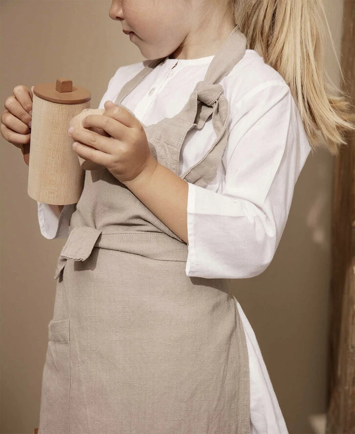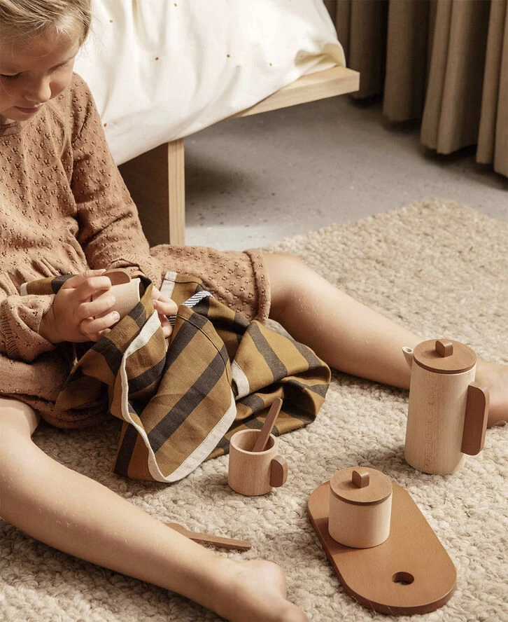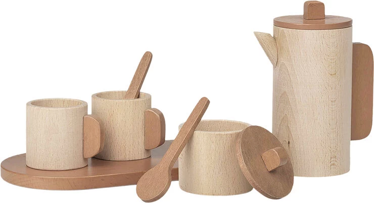 Hold et teselskab for alle dine foretrukne bamser med Toro Tea Set. Dette sæt med legetøjsservice omfatter en bakke, en tepotte, to kopper med skeer samt en sukkerskål fremstillet af naturligt bøgetræ med malede detaljer, der matcher Toro Play Kitchen og skaber en fin kontrast. Bakken kan hænges fra krogene på legekøkkenet, og hele sættet passer ind på køkkenets nederste hylder.
