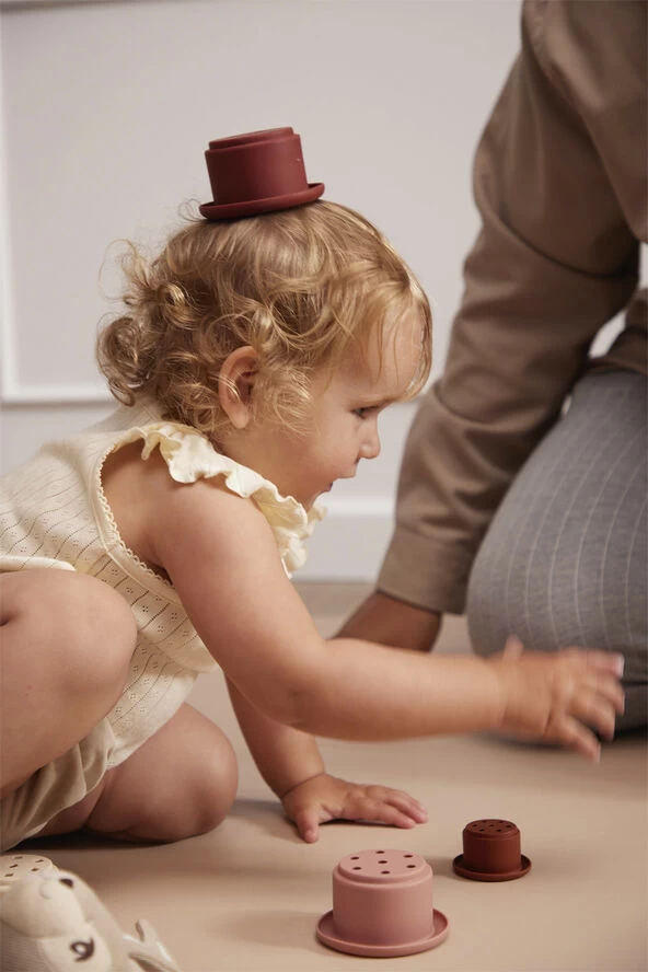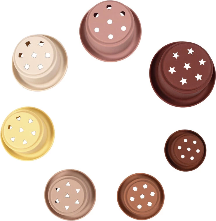 Stabl alle syv kopper for at skabe dit eget lille tårn og opdag, at det er lige så sjovt at vælte det, som det er at stable det! Vores stablelegetøj udvikler dit barns fin- og grovmotorik samt hånd-øje-koordination og med huller i bunden er stablekopperne også perfekte til leg i badet. De bløde og fleksible stablekopper er lavet af slidstærk og superblød silikone, som også tåler opvaskemaskine.