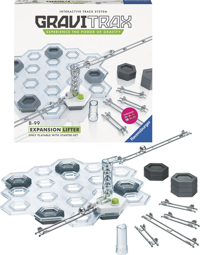 Transport r dine kugler opad igen! Med dette sæt løfter du dit kuglebaneunivers op på et nyt niveau Kombin r liften og de andre byggeelementer med dit GraviTrax -startersæt, og få endnu mere action på din kuglebane Hvor mange kugler transporterer du opad igen med liften? Indhold 1 Lifter, 7 metalkugler, 1 transperant niveau plade, 8 lange højdeskinner, 4 korte højdeskinner, 1 lang plastskinne, 2 medium lange plastskinner, 3 kort plastskinner Kan kun anvendes sammen med GraviTrax -startersættet Fra 8 år