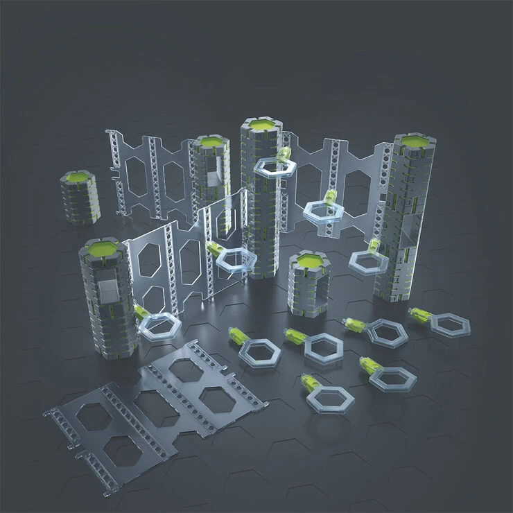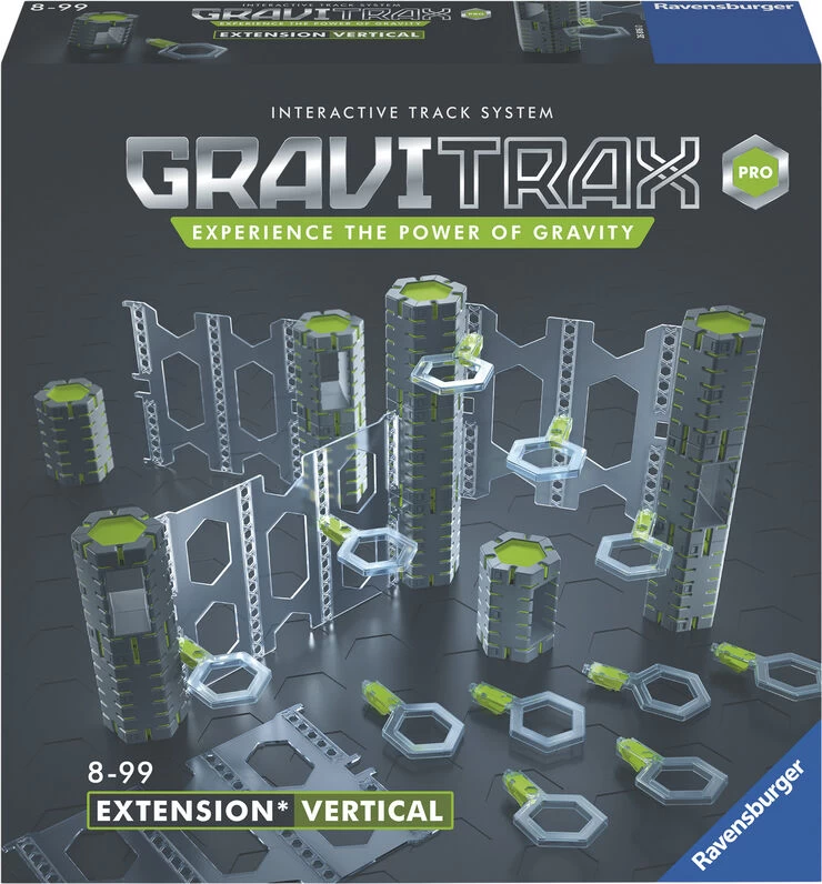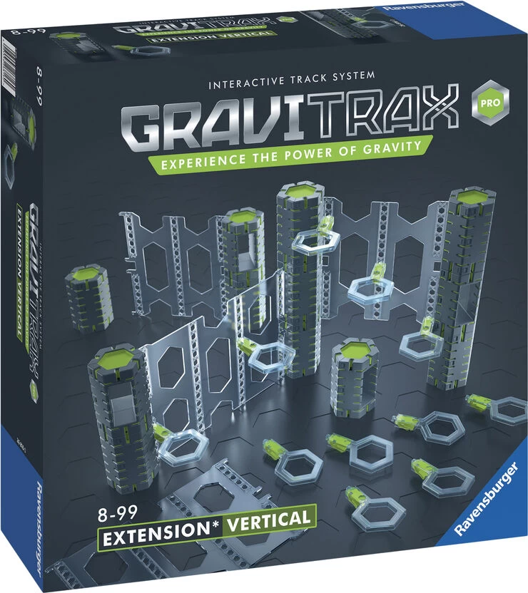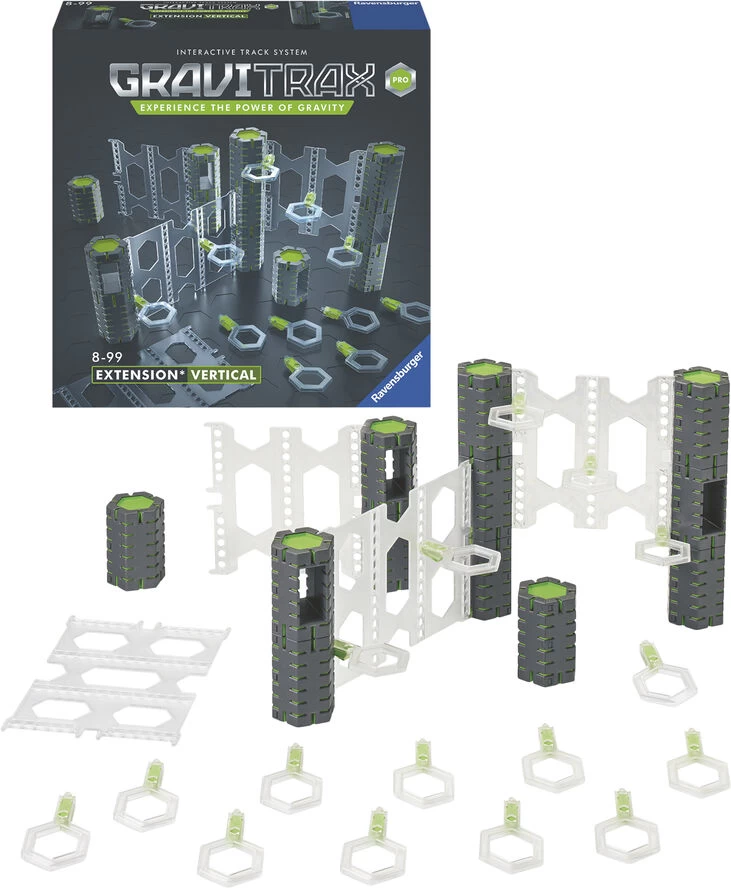Lodrette effekter til din kuglebane! GraviTrax PRO Vertical udvidelsessæt indeholder 33 ekstra elementer, så du kan nå nye højder med din bane Skab dynamiske kuglebaner med vægge, søjler og balkoner, der løfter dine baner til nye højder Uanset om du bygger tårnhøje, tredimensionelle strukturer eller ophængte skinner. kan du se, hvor højt og smart du kan bygge Kombin r med GraviTrax Pro Starter Set, og tag din bane til et nyt niveau Se flere oplysninger på Gravitraxcom Indhold 8 søjler, 4 tunnelsøjler, 2 lange vægge, 3 mellemlange vægge, 16 balkoner Fra 8 år