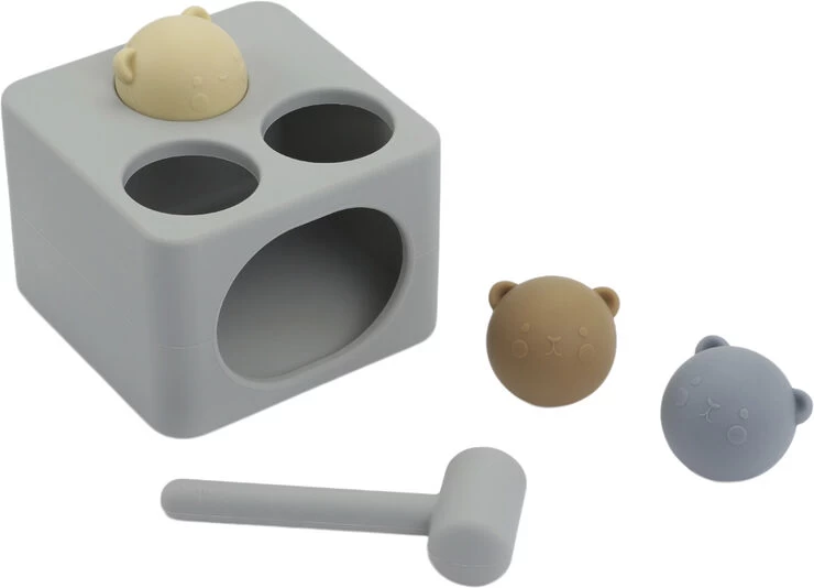 “Hamster knockout Playset made in 100 percent silicone. Practice fine motor skills when using the silicone mallet to hammer the three balls through the round holes. Suitable for children 18 months and older.”