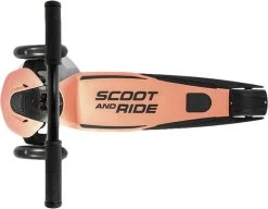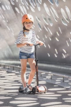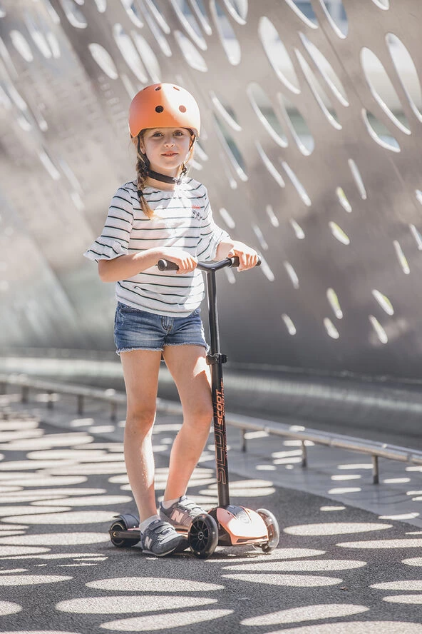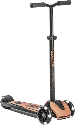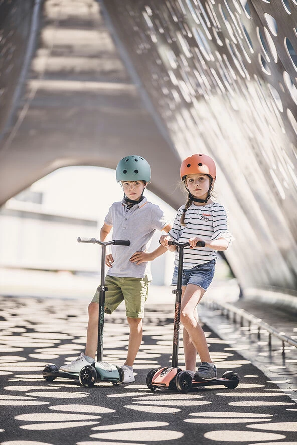 The Highwaykick 5 is the ultimate kickboard for kids and adults. High-grip & shock-absorbing jumbo wheels with white led wheels on the front and a durable sandwich construction allow a 80 kg payload easily. The deck comes extra-wide and long with anti-slip rubber. The height adjustable T-bar can be removed by a simple push of a button.