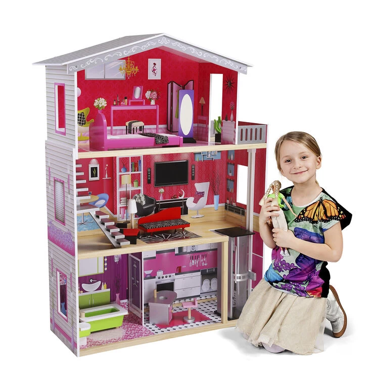 Kæmpe mannequindukkehus i træ Fuldt møbleret og solidt kvalitetsdukkehus i 3 etager Måler 115×82.5×32 cm Uden dukke
