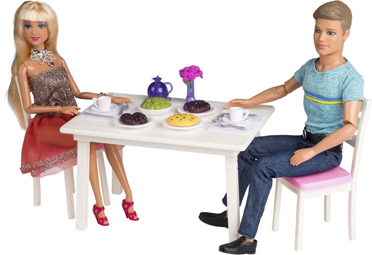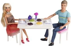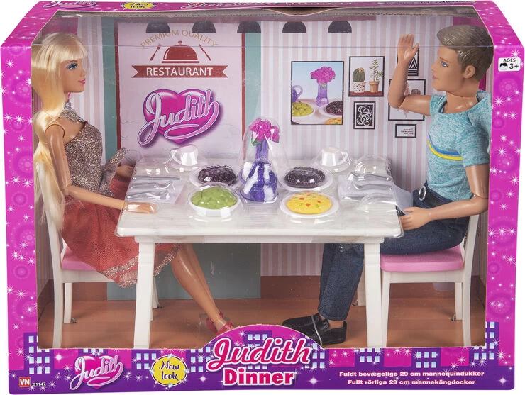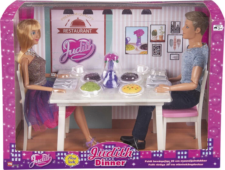 Judith og Jack middagssæt Sæt med 2 fuldt bevægelige mannequindukker, stole og dækket bord