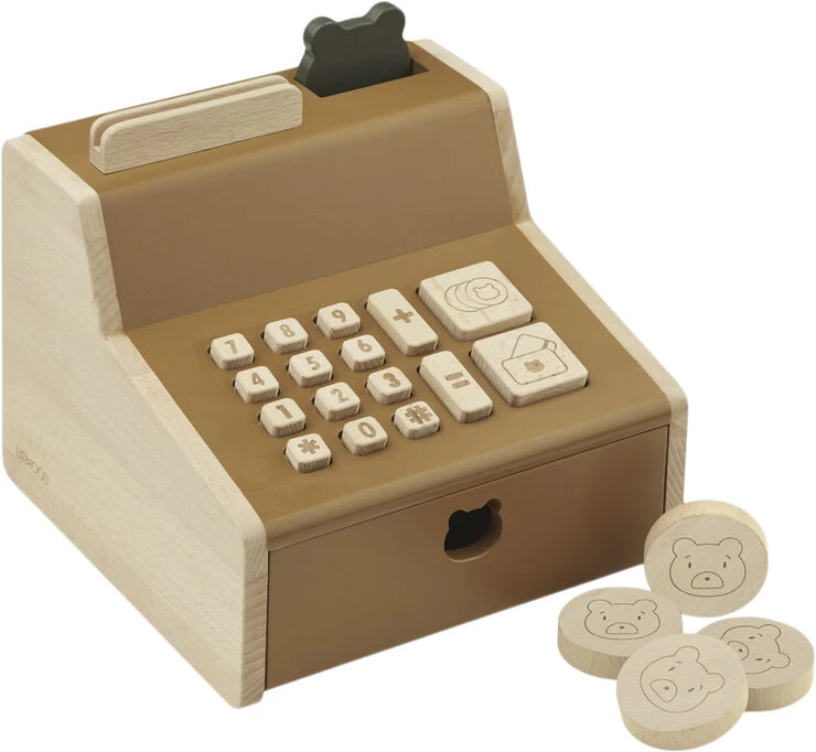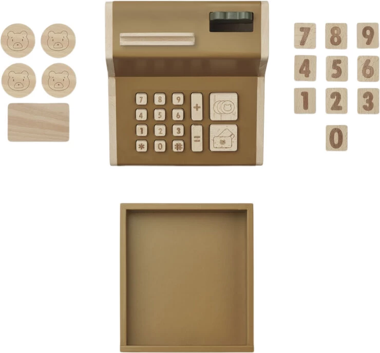 CASH REGISTER Pretend cash register The set includes- Cash register with pushable buttons, movable drawer and a coins slot, a credit card swiper, ten numbers from 0-12, four coins and a credit card CE marked