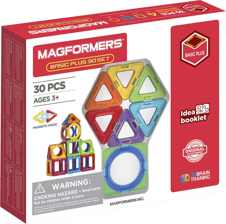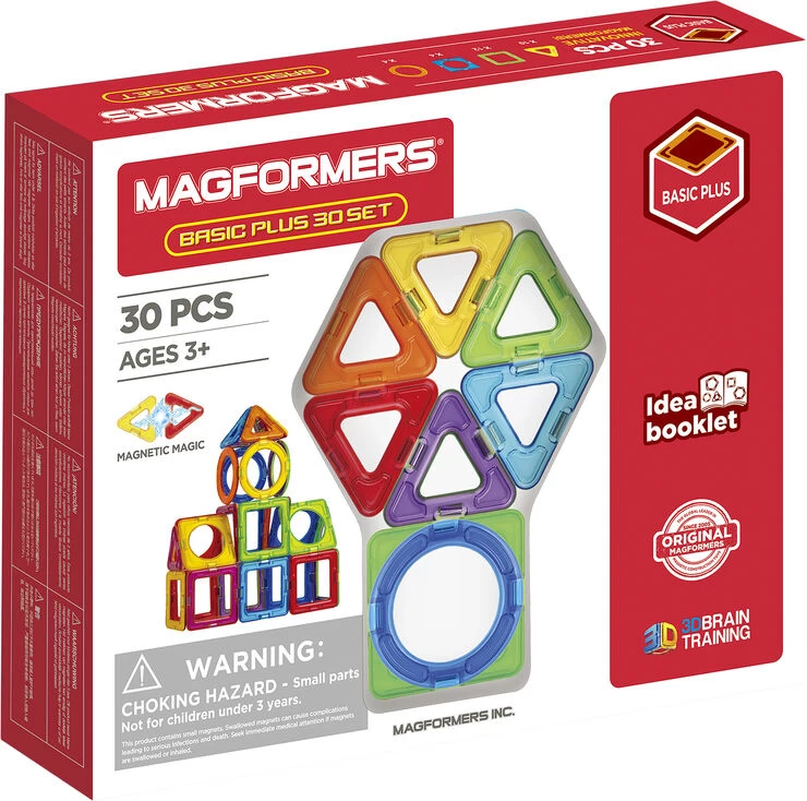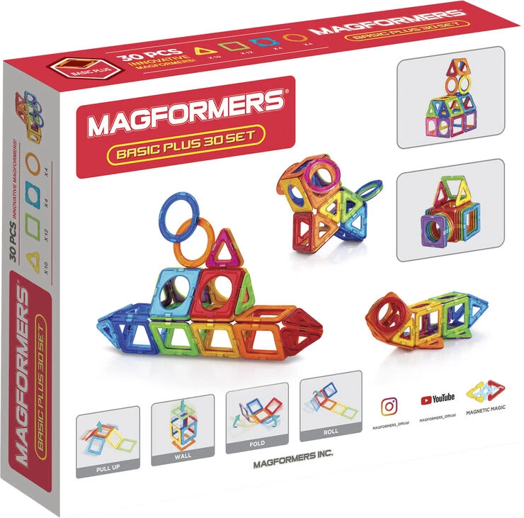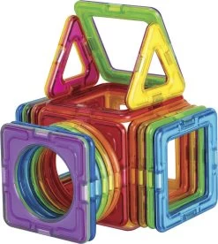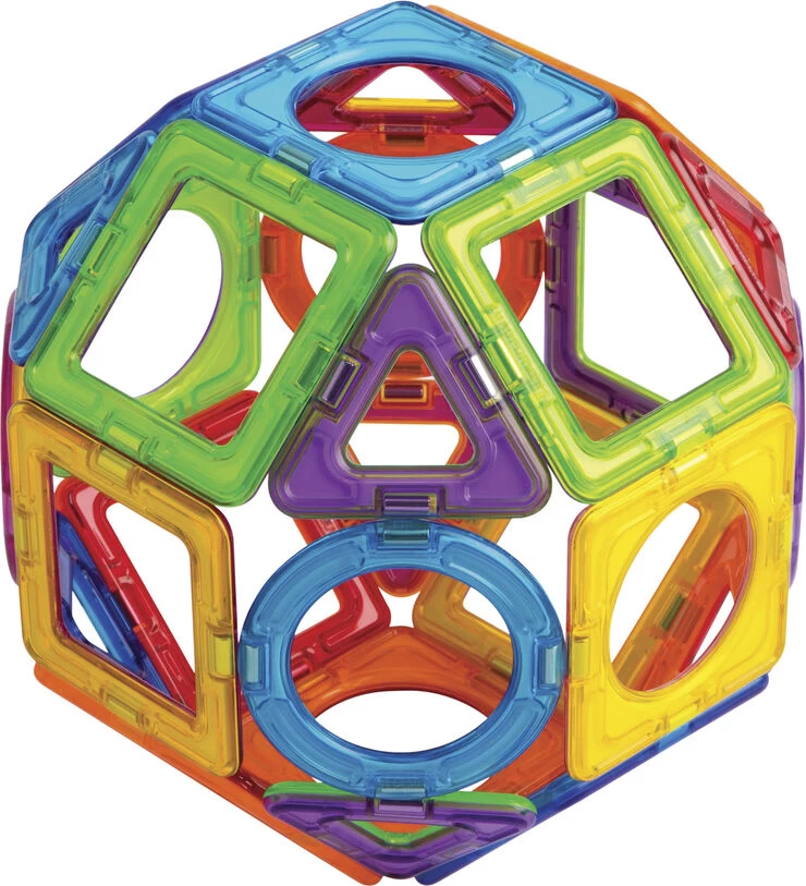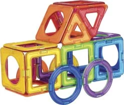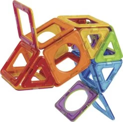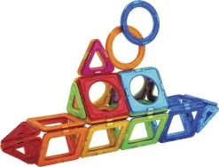Sættet indeholder 4 cirkler, 4 firkanter med cirkelformede huller, 12 firkanter og 10 trekanter
