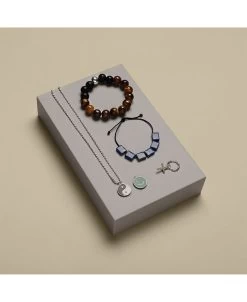 DIY – smykkedesign Boys Bead Box er fyldt med smarte smykkedele. Flotte tigerøje-sten, mat onyx og blå resin til at anvende i knyttede armbånd. Den friske, sølvbelagte kæde kan bæres alene eller med det specialdesignede smiley eller Yin-Yang vedhæng. I pakken medfølger også et par øreringe og et dagmarkors. Smykkeværktøj, som skal anvendes til at samle smykkesættene, sælges separat (varenummer BOX307001). Emballage: 18,5 x 11,5 x 3 Alder: 6+