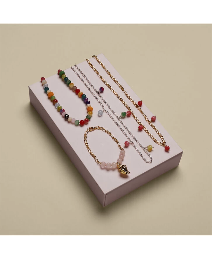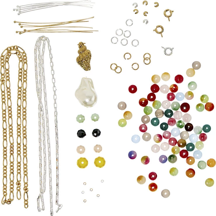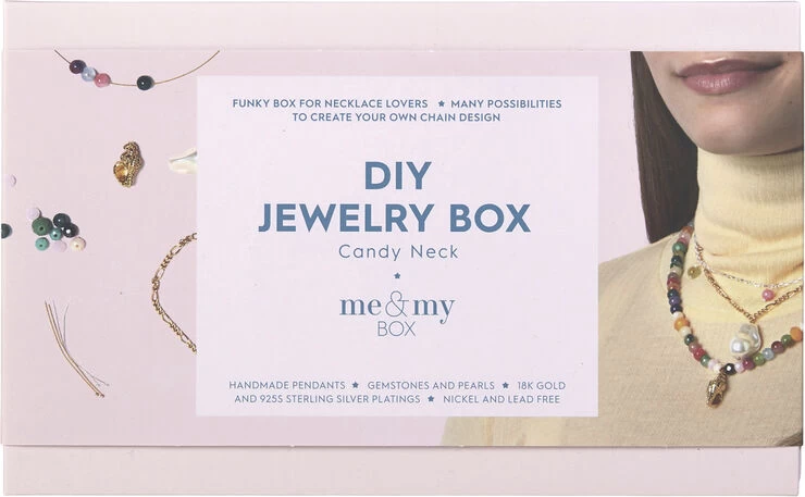 DIY – smykkedesign Candy Neck Box er, som navnet antyder en godtepose af lækre og farvestrålende smykkedele til at designe dine egne halskæder. Kombiner for eksempel perlerne med en stor barokperle eller den forgyldte konkylie i en figarokæde. Der er 2 meter forskellige kæder i æsken, så der er både mulighed for at designe halskæder, armbånd eller ankelkæder. Smykkeværktøj, som skal anvendes til at samle smykkesættene, sælges separat (varenummer BOX307001). Indeholder: 18 karat guldbelagte og sterling sølvbelagte dele, nikkel- og blyfri. Vedhæng: Slange, konklylie, logomønt. Perler: Halvædelstene, blandede, facetterede glasperlerog en shell perle. Figarokæde, kæde med ovale led, smykketråd, øskner, låse, perlestave, wireklemmer, knudeskjulere. Emballage: 18,5 x 11,5 x 3 Alder: 6+
