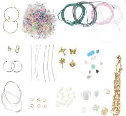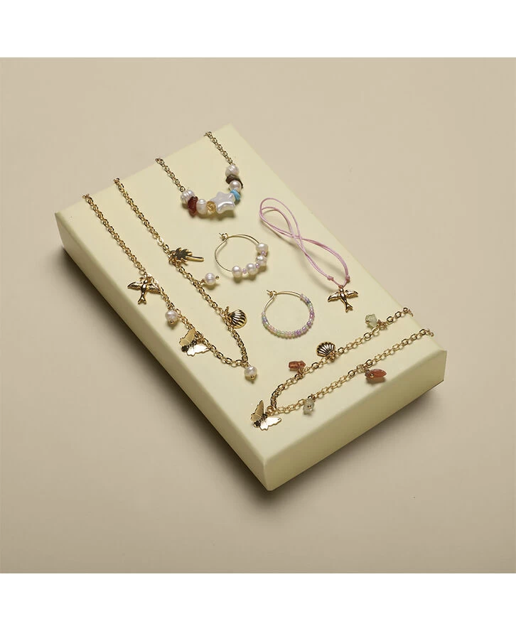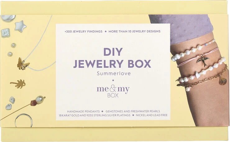 DIY – smykkedesign Summerlove Box er et gør-det-selv smykkesæt, som indholder alt, hvad der rimer på forår, sommer, sol og varme. De tidløse smykkedele er selvfølgelig smukke hele året. Æsken er fyldt med alt fra ferskvandsperler, shellperler og glasperler til halvædelsten som ametyst, rosaquartz, onyx og citrin. Design dine egne lækre smykker, som ligner de allerbedste designs. Smykkeværktøj, som skal anvendes til at samle smykkesættene, sælges separat (varenummer BOX307001). Indeholder: 18 karat guldbelagte og sterling sølvbelagte dele, nikkel- og blyfri. Vedhæng:Stjerne, fugl, musling, palmetræ, sommerfugl. Perler: Glasperler, ferskvandsperler, citrin. Hoops øreringe, ankerkæde, smykketråd, øskner, låse, perlestave, nylonsnor, silikone elastiksnor. Emballage: 18,5 x 11,5 x 3 Alder: 6+