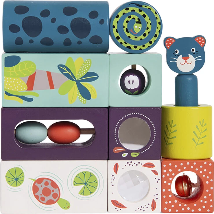 11 træklodser i jungleseriens farver. Klodserne har forskellige lyde, når de rystes. Når Zimba, den blå panter bliver presset, og derefter frigjort – springer den op af en klods. Hver lyd hjælper med at stimulere barnets sanser. Materiale: Træ Rengøring: Overfladen aftørres med en fugtig klud Produkt: 16 x 16 x 4,5 cm Emballage: 17 x 17 x 4,5 cm Alder: 1-3 år