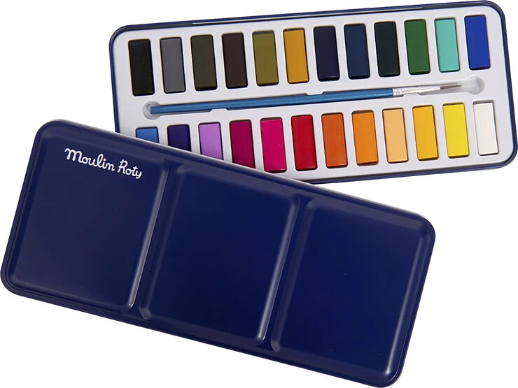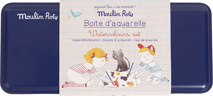 Metalæske med 24 akvarelfarver i stærke farver. Æskens låg kan bruges som palette, så man kan blande farverne. Ideelt til den lille kunstners første malerier! Indhold: Metalæske, 24 akvarelfarver, pensel Moulin Roty,akvarelfarver,vandfarver,akvarelmaling