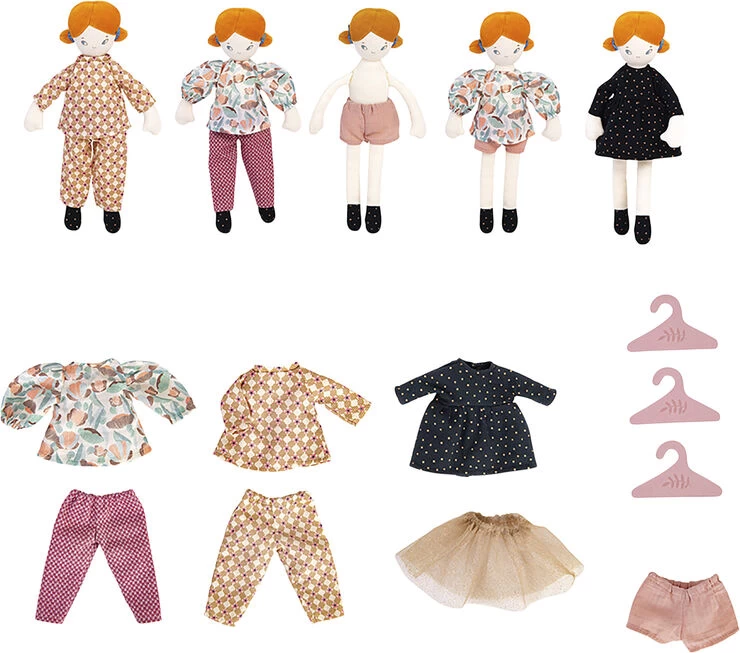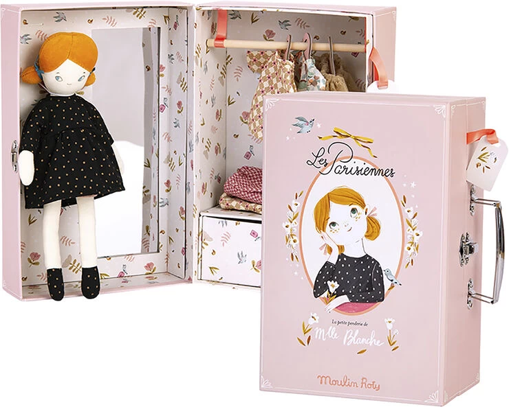 En lille kuffert, der åbnes som garderobeskab. Tøjdukken Blanche på 26 cm medfølger samt 3 sæt tøj. Vaskeanvisning: Rengøres på overfladen med en fugtig klud. Må ikke tørretumbles. Materiale: Bomuld, polyester, kraftigt pap Skab: 28,5 x 18,5 x 12,5 cm Alder: 4-7 år