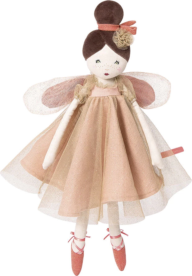 En yndig fortryllende fe. Denne fine kludedukke har etsmukt broderet ansigt. Hun er iklædten pudderfarvetkjole med tyl, har småfe vinger og fineballetsko med satin bånd. Materiale: Bomuld, polyester, lurex, polyamid. Kan maskinvaskes ved 30°C uldprogram. Tåler IKKE tørretumbler. Produkt: 45 cm Alder: 10mdr-7 år
