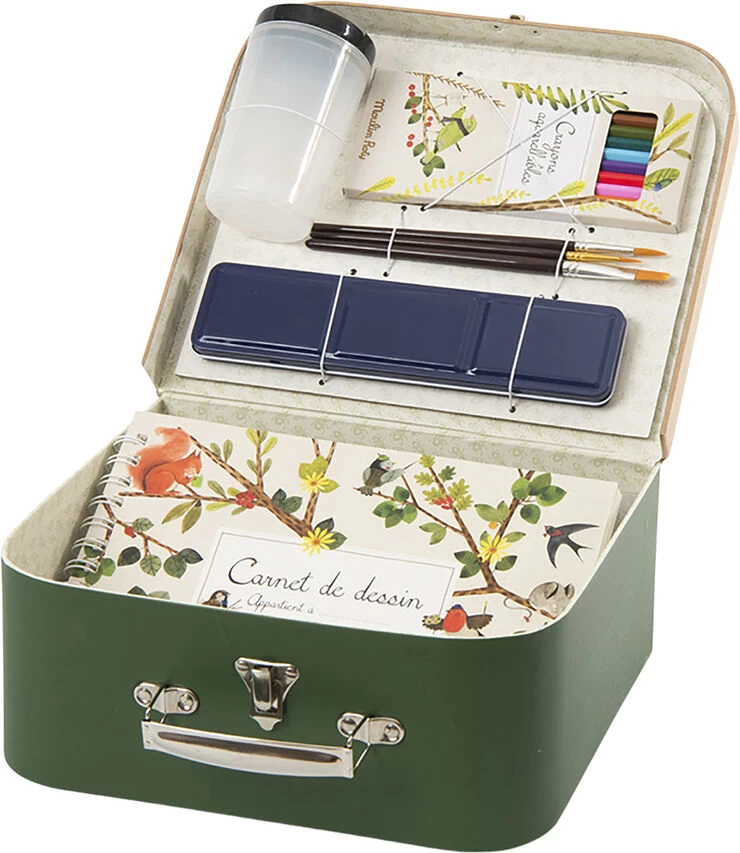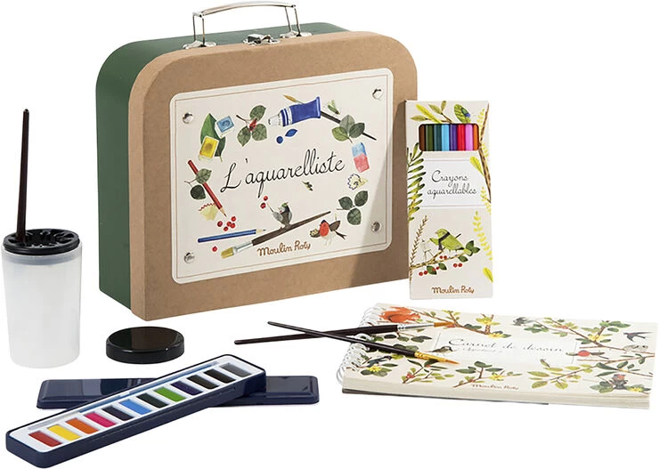 Den perfekte malerkuffert til en kommende akvarelkunstner. Dette sæt gør det muligt, at tegne smukke naturscenarier med alt hvad du behøver for at opdage din kunstneriske side! Indhold: Kuffert med metalæske med 12 akvarelfarver, 10 akvarelblyanter, 3 børster, vandkrukke og blok med akvarelpapir. Kuffert: 27 x 23 x 10,5 cm Alder: 4-10 år