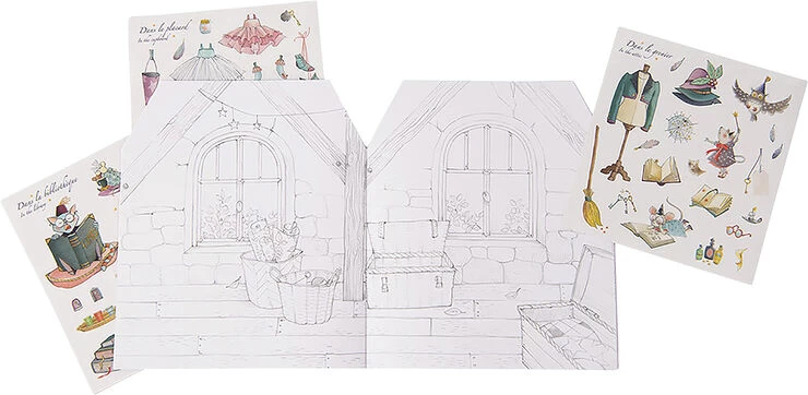 En vidunderlig malebog med 160 klistermærker til ekstra dekoration. Et helt hus i en bog, 8 forskellige værelser tegnet i sort hvid udgør et hyggeligt hjem at opdage i selskab med frække små mus. Indeholder 20 ark med klistermærker. Alder: Fra 3 år og opefter.Antal sider: 60.Mål på skitseblokken: 21,5 x 28 cm.