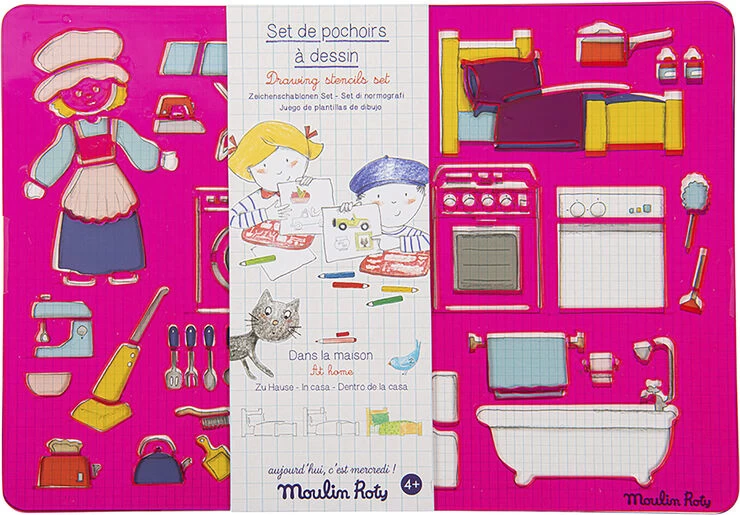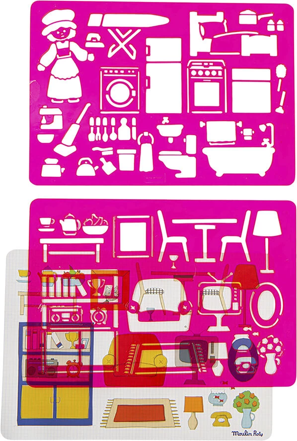 Sæt med to stencils, så man let kan tegne alting fra hjemmet: Møbler, pynt, køkkenting og toiletsager. Disse stencils er fremstillet af plastic, så de kan vaskes af og bruges igen og igen! Materiale: GPPS Produkt: 27 x 19 cm Alder: 4-8 år