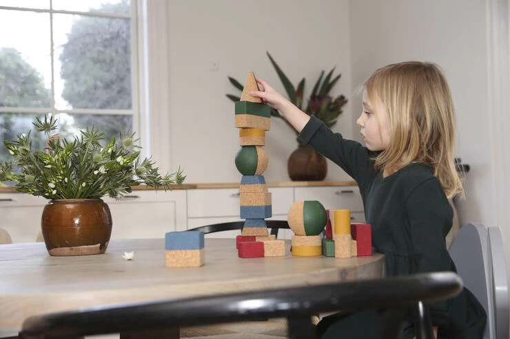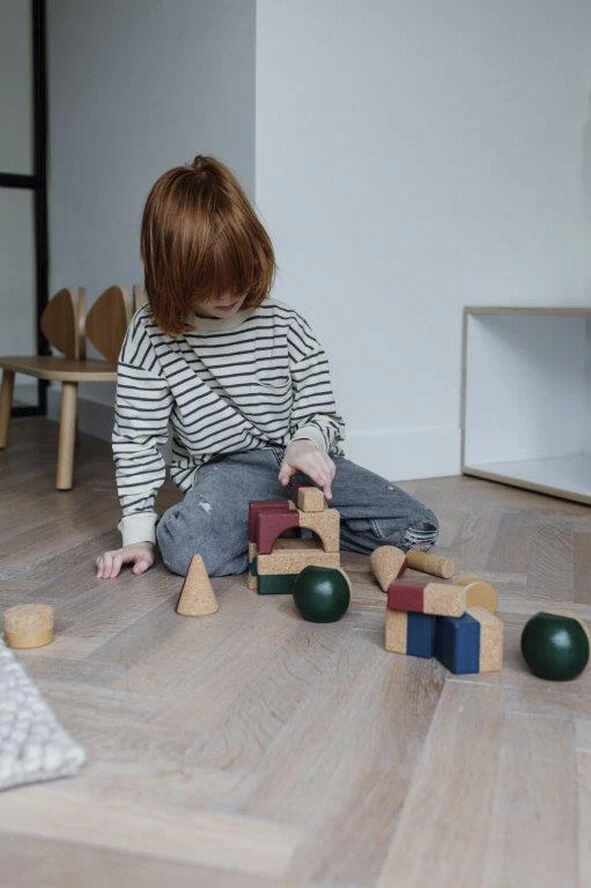Farverige byggeklodser i økologisk kork 18 håndmalede byggeklodser i forskellige geometriske former og størrelser. Designet til små arkitekter, klodser der indbyder til en sjov leg med læring undervejs. Fremstillet af 100% økologisk kork, malet med non-toxic maling og pakket i opbevaringspose syet i 100% økologisk bomuld. Styrk dit barns finmotorik og kreativitet med Nofred´s bløde byggeklodser. Se, hvem der kan bygge det højeste tårn eller det største hus, samtidig med at du styrker dit barns fornemmelse af balance og finmotoriske udvikling. Det er sjov leg med læring i sigte. Smukke former, der giver dit barn fornemmelsen af geometriske former og størrelser. Blødheden går igen i valget af det lette naturkork, som det bærende materiale, håndmalet med giftfri maling. Klodserne er bløde at røre ved og lege med, de larmer ikke, når de falder på gulvet, og samtidig undgår du hakker i gulvet og ømme fødder. Inkluderer 18 klodser samt en opbevaringspose i økologisk bomuld. / Dansk design af Nofred