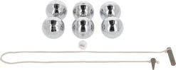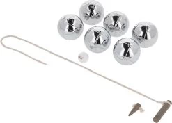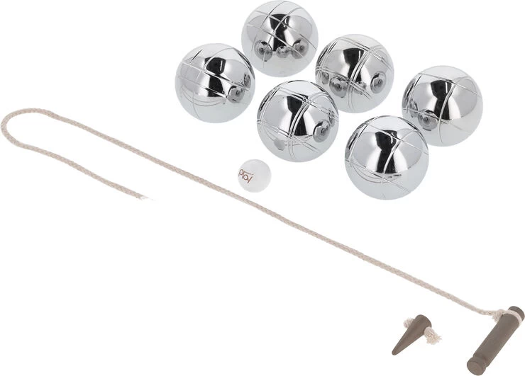 Spil det populære petanque i haven, i sommerhuset, på stranden eller til havefesten. Spillet består af seks metalkugler med tre forskellige mønstre og en lille kugle af træ. Trækuglen kaldes grisen, og det gælder om at kaste metalkuglerne tættest på grisen. Der medfølger en målesnor, spilleregler på dansk og engelsk samt en lækker pose til transport og opbevaring af spillet. Kuglerne er fremstillet af jern med en vejrbestandig nikkel-kromlegering, grisen af hvidbejdset gummitræ. Tør delene over med en fugtig klud efter brug og opbevar dem altid i tør og rengjort stand, så holder spillet længere og giver større fornøjelse.