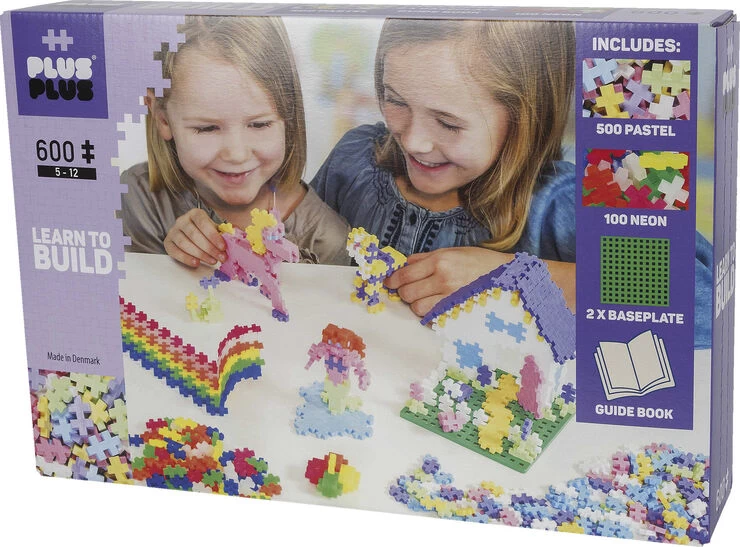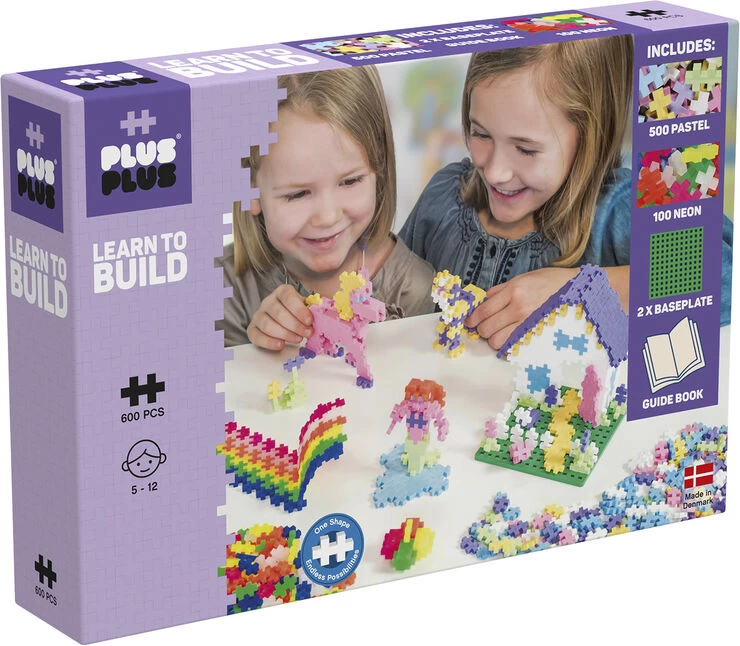 Plus-Plus Learn To Build sæt indeholder alt hvad du har brug for for at komme i gang med Plus-Plus. En guide bog giver trin-for-trin instruktioner til at bygge flade mosaikker og 3D-kreationer – dyr, mennesker, bygninger og mere. Sættet indeholder 500 Pastel-farveblandingsstykker, 100 Neonfarveblandingsstykker, 2 bundplader og en guidebog.